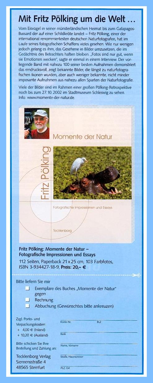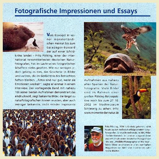 Vorwort "Fotos sind nur gut, wenn sie beim Betrachter Emotionen wecken", sagte Fritz Pölking einmal in einem Interview. 1936 in Krefeld geboren, zählt der heute in Greven bei Münster lebende gelernte Fotografenmeister zu den weltweit erfolgreichsten Naturfotografen. Er wurde mehrmals im BBC-Wildlife-Wettbewerb in London ausgezeichnet und erhielt als erster deutscher Fotograf den Titel des "Wildlife Photographer of the Year". Seine Bilder erscheinen in allen namhaften Magazinen der Welt und illustrieren zahllose Bücher. Allein über 1000 Mal veröffentlicht wurde seine Aufnahme eines Galapagosbussards, der auf dem Rücken einer Elefantenschildkröte landet. Dieses sensationelle Foto - aufgenommen 1981 - machte Fritz Pölking mit einem Schlag international bekannt und begründete seinen Ruhm als einer der ganz Großen in der Naturfotografie. Wer selbst mit der Kamera auf die Jagd nach Motiven in der "freien Wildbahn" geht, weiß natürlich, daß eine Menge Glück dazugehört, solche "Volltreffer" zu erzielen. Doch bei Fritz Pölking ist es das Glück des Tüchtigen. Hartnäckigkeit, Geduld, umfangreiche Kenntnisse über das Verhalten der Tiere und die Fähigkeit, zur rechten Zeit am richtigen Ort zu sein - die Kombination dieser Eigenschaften bildet das Erfolgsrezept für solche herausragenden Aufnahmen. Die Entstehungsgeschichte des spektakulären Fotos belegt diese Maxime eindrucksvoll: Von früheren Besuchen der Galapagos-lnseln wußte Fritz Pölking, daß dort - und nur in einem bestimmten Gebiet, am Rand des Vulkans Alcedo - junge Bussarde auf dem Rücken von Elefantenschildkröten landen und spielerisch-neugierig Ausschau halten. Allerdings: Um in den Krater zu gelangen, mußte man mindestens acht bis zwölf Stunden über Lava bergauf in der Äquatorhitze marschieren und Zelt, Wasser sowie Proviant für mindestens drei Tage mitnehmen. Pölking ließ sich von diesen enormen Strapazen nicht abschrecken. Fest entschlossen, das Bild der "friedlichen Koexistenz" von Greifvogel und Schildkröte eindrucksvoll einzufangen, stellte er sich nicht nur auf drei, sondern gleich auf zehn Tage Aufenthalt am Vulkankrater ein und schleppte neben der sonstigen umfangreichen Ausrüstung zusätzlich 20 Liter Wasser mit sich. Diese schweißtreibende Mühe wurde mit einer einzigartigen Aufnahme belohnt, die sicher eines der wunderbarsten Tierfotos des 20. Jahrhunderts darstellt. 1982 gewann Fritz Pölking mit dem Bild unter 75 000 eingesandten Dias im Wettbewerb der US-Zeitschrift "National Wildlife" den ersten Preis. 1996 machte Pölking mit einem anderen aufsehenerregenden Projekt Furore: Im Altai-Gebirge, dem unwegsamen Grenzgebiet zwischen Mongolei und China, ging er auf die Suche nach Schneeleoparden. Fotos dieser geheimnisumwitterten, extrem seltenen und besonders gefährdeten Wildkatzen waren bisher kaum bekannt. Nach intensiver Spurensuche im eisigen Klima des asiatischen Hochgebirges entdeckte er plötzlich zwei Jungtiere, behielt die angespannten Nerven unter Kontrolle und nutzte den kurzen Überraschungsmoment für eine Bildserie - die ersten Aufnahmen, die einem Europäer von frei lebenden Schneeleoparden gelangen. Doch Pölking geht es nicht nur um die spektakulären, einmaligen oder abenteuerlichen Motive. Ganz besonders interessieren ihn Langzeitstudien über bestimmte Tierarten oder "Tierpersönlichkeiten". Ein Beispiel für diese Art der Annäherung an die Welt der wilden Tiere ist seine aufwendige Reportage über die Leopardin "Paradise" in der Masai Mara in Kenia. Jahrelang flog Pölking immer wieder in kurzen Abständen nach Afrika, um das Leben dieser gefleckten Großkatze mit all ihren Kindern und Enkeln in dem ostafrikanischen Naturreservat zu dokumentieren - ein international einzigartiges Projekt! Fritz Pölkings Fotos fesseln uns durch die Anmut der "Hauptdarsteller", die Perfektion der technischen Mittel und die Schönheit der Komposition. Doch Pölking fotografiert die Natur so, wie sie ist, und nicht, wie wir sie uns vielleicht klischeehaft vorstellen. Deshalb sind auch Schmerz und Tod, Fressen und Gefressenwerden ein selbstverständlicher Teil seiner Motivwelt, etwa in der dramatischen Bildserie eines Krokodils, das eine Gazelle verschlingt, oder bei der Sequenz eines Fischadlers, der einen noch lebenden Wels zu seinem Horst transportiert. Anders als manche seiner Kollegen, die solche Szenen mit Tricks und Effekten sensationell aufbauschen, vermeidet Pölking bei dem notwendigen Blick auf die mitunter brutale Wirklichkeit des Lebens in der Natur jede Überzeichnung und bleibt der nüchtern-sachliche, aber dennoch immer hautnah beteiligte Chronist. "Naturfotografie ist Wahrheit", schrieb Pölking in einem seiner mittlerweile 14 Bildbände und Lehrbücher. Diesem Credo folgend, plädiert Pölking angesichts der heute fast unbegrenzten Manipulationsmöglichkeiten vehement für eine unverfälschte Wildlife-Fotografie und eine klare Kennzeichnung der Bilder. Die Aufgabe, Naturfotos künftig streng nach den Kategorien echt, arrangiert, captive und manipuliert zu klassifizieren und mit diesem "Gütesiegel" unterscheidbar zu machen, ist in der Tat eine der großen Herausforderungen für die Verbände der Naturfotografen sowie für die Verlage, Bildagenturen und Printmedien. Von der Lösung dieses Problems wird zweifellos abhängen, ob die authentische Wildlife-Fotografie Zukunft hat und glaubwürdig bleibt. Das wäre dann gewiß auch Fritz Pölkings Verdienst, dem dieses Buch mit fast 100 Höhepunkten aus seinem langjährigen Werk gewidmet ist. Dr. Holger Rüdel, Dieser Band begleitet eine vom Stadtmuseum Schleswig organisierte Ausstellungstournee, die in den nächsten 3-4 Jahren an vielen Orten in Deutschland zu sehen sein wird.