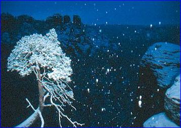 Abdrücken - fertig ? In der Gesellschaft Deutscher Tierfotografen reifte die Idee, einmal als Gemeinschaftswerk die Natur in Deutschland zur Jahrtausendwende in Buchform festzuhalten, sozusagen um in einer fotografische Momentaufnahme zu zeigen, wie es jetzt bei uns draußen aussieht. Für den ersten Morgen im Jahre 2000 hatte ich für dieses Projekt um 7.00 Uhr am 1. Januar 2000 eine Waldkiefer im Nationalpark Sächsische Schweiz fotografiert. Nun meinte später im Oktober der zuständige Lektor im Verlag, dass es doch schön wäre, wenn wir das Buch mit dem gleichen Motiv beenden, mit dem es quasi 365 Tage vorher begonnen hatte. Was für mich bedeutete, am 31. Dezember 2000 in der Sächsischen Schweiz noch einmal diese Waldkiefer zu fotografieren, obwohl ich eigentlich andere, häusliche Pläne für Sylvester hatte, die mit Sekt, Konfetti und Feuerwerk zu tun hatten. Wenn man ein Motiv an einem bestimmten Tag fotografieren muß oder soll, ist das immer eine diffizile Sache. Für jedes Motiv gibt es eine bestimmte Beleuchtung, eine Atmosphäre oder eine Jahreszeit, in der es am besten zur Geltung kommt. Wenn man auf einen Termin festgelegt wird, muß man versuchen, das beste aus der Situation zu machen. Zuerst überlegte ich, was den kommen könnte am 31. Dezember, 30 km südlich von Dresden: Regen - war am wahrscheinlichsten und am schlechtesten. Nebel - wäre nicht übel. Schnee - wäre fantastisch. Sonne oder mieses, trübes Matschwetter? Meine Idealvorstellung wäre heftiger Schneefall am Tage und dann ein sternenklarer Abend. Dann könnte ich die Waldkiefer anblitzen, und eine Zeitbelichtung machen. Beginn um 23.30 Uhr am 31. Dezember bis um 0.30 Uhr am Morgen des 1. Januar 2001. Das wäre außerdem ein sehr ungewöhnliches Bild, weil es praktisch eine Aufnahme aus 2 Jahrtausenden ist. Zur Hälfte im alten und zur Hälfte im neuen Jahrtausend belichtet........! Mit Sternenbahnen am Himmel in das dritte Jahrtausend.... Toll. Nun sind solche Fotos technisch immer etwas problematisch, wenn man eine Blitzaufnahme mit einer Zeitbelichtung koppeln will. Wie stark abblenden? Wie lange belichten? Auf welchen Wert die Blitzenergie einstellen und auf welchen Ausleuchtwinkel? Wie eine Balance, eine ausgewogene Lichtverteilung zwischen Blitzlicht und natürlichem Licht hinbekommen? Wie ist überhaupt die Situation dort im Nationalpark zu Sylvester? Böller und Leuchtraketen? Wie reflektieren die Felsen das (eventuelle) Mondlicht bei 1 oder 2 Stunden Belichtung? Nun wollte ich auf keinen Fall diese einmalige Situation, die ein einmaliges Bild versprach, an einem technischen Fehler scheitern sehen. Daher fuhr ich schon drei Tage eher an die Location, wie es ja jetzt auf Neudeutsch heißt, und machte erste Probeaufnahmen. Schon der erste Abend brachte mich nahe an einen Herzinfarkt. Unten in der Wehlschlucht war eine Freilichtbühne, auf der im Sommer Theaterstücke aufgeführt werden, die aber im Winter unbenutzt ist. Anscheinend aber vom Ort Raethen den ganzen Winter hindurch jede Nacht von 30 Scheinwerfer erleuchtet wird. Außer das der Ort zu viel Geld hat, ist kein Sinn in dieser unökologischen Energieverschwendung im Nationalpark zu erkennen. Wieso überhaupt ein erleuchteter Nationalpark die ganze Nacht hindurch? Am nächsten Morgen fuhr ich nach Dresden, wo ich - dank Internet - wußte, das es ein Fotogeschäft gab, das Diafilme im Einstundenservice entwickelte, was ja sehr selten ist. Die ersten Testaufnahmen sahen gut aus. Egal ob 1, 2, 4 oder 6 Blitze auf die Kiefer, alles war brauchbar, aber mit 4 Blitzen und Blende 4.0 war das Ergebnis perfekt. Nur das Kunstlicht der Freilichtbühne machte Probleme. Vom idealen Standpunkt aus gab es unten links im Dia einen etwas großen Lichtflecken durch dieses Kunstlicht. Ich mußte also mit der Kamera einen Meter weiter nach links gehen, wodurch zwar die Komposition litt, aber der Einfluß der Bühnenbeleuchtung nicht mehr ganz so schlimm war. Am nächsten Abend hatte ich riesiges Glück, denn es war sternenklar, und ich konnte alles überprüfen für den Ernstfall in der nächsten Nacht. Kalte Dusche.... Es war zwar ein wunderschöner Sternenhimmel, aber nicht da wo mein Motiv sich befand. Über mir herrliche Sterne, rechts von mir herrliche Sterne und hinter mir auch. Aber in Richtung Waldkiefer und Felsen war nur dunkle Nacht.... Kismet. Was der Test allerdings auch zeigte war, das ich alles noch bei Tageslicht aufbauen, einrichten und justieren mußte. In völliger Dunkelheit war es nicht zu machen. Außerdem mußte ich die Zeitbelichtung sehr variieren, je nach Zustand des Himmel, ob es eine dunkle Nacht war, oder bewölkt, was den Himmel wesentlich heller machte, oder eben mit Sternen. Daher wollte ich mit zwei Kameras arbeiten, der EOS-1 mit dem 24-85 mm Objektiv, und der EOS-3 mit dem 22-55 mm Objektiv. Die zwei Blitze die ich vor Mitternacht auslösen wollte und die zwei für nach Mitternacht, konnten ja beide Dias in beiden Kameras gleichzeitig belichten. Nur die Zeitbelichtungen für beide Kameras wollte ich variieren. Die Blitze dann jeweils 2 ausgelöst 1 Minuten vor Mitternacht und 2 ausgelöst 1 Minuten nach Mitternacht. Es sollte ja alles seine Ordnung haben... Das würde bedeuten, ich mußte Silvester um spätestens 16.30 Uhr meine beiden Kameras aufbauen und alles vorbereiten, um dann ungefähr 7 Stunden in der Dunkelheit zu warten, bis die Zeit der beiden Aufnahmen kommen würde. Witzig, witzig... alles schüttet Sekt in sich hinein, und nur so ein seltsamer Naturfotograf steht in der Sivesternacht für 6-8 Stunden auf einer Eisenbrücke über dem Abgrund und wartet auf die Jahrtausendwende.... Die eigentlichen Aufnahmen aus zwei Jahrtausenden gingen dann völlig problemlos über die Bühne. Die Nacht war nicht sehr kalt, etwa 1-2 Grad minus, der Himmel war erst bewölkt und dann sternenklar - kein Wind. Alles recht angenehm, nur die lange Wartezeit war etwas langweilig. Wie sich allerdings später herausstellte, hätte ich m