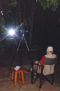 As smart as we are, we have been working according to these methods for days, but to no avail. In addition to all this you need a good portion of luck and at least a third of the Leopardīs territory canīt be checked because the car, in spite of the 4-wheel drive, canīt pass through every ditch. Parts of the area are just too rocky or densely overgrown. Besides that, now in May the grass is so high that the Leopard doesīnt even have to crouch down in order not to be seen. May 8th, 1994 Africa is really great !! Now, in May, almost every night at sunset one or two Bats come flying into my bathroom behind the tent and hang on the shower head in order to eat the insects and moths they brought and more than likely caught outside. Torn off insect wings, probably not suitable for palate of a Bat, trickle down onto the floor of my shower. After an up side down meal, they immediately fly off again in search of other prey. They donīt stay during the day, so obviously they hang somewhere else then. My bathroom is just a sort of dining room. Maybe it is too bright during the day for them. Why are the best pictures usually failures and the unimportant ones a success? On my tour in March I had taken a super picture and I was one hundred percent sure that it turned out. The result from the lab later on showed that the flashed slides were a t l e a s t two whole shades underexposed. It was on a very early morning in March, somewhere between total darkness and the very first light of dawn. The female Leopard sat on the very first limb of an acacia tree about one meter above the ground and in which crown the two little ones were chewing happily on a dead Impala, as two Hyenas approached to female Leopard up to about 2 meters away from her and she hissed at them. A superb picture in the life of the nocturnal African bush and maybe never photographed before. I had turned the SB-24 onto full power and the angle of the flash to 85 mm, a Fuji Chrome 100 in the camera and the Sigma 2,8/70 210 mm on the 2,8 shutter. I was a hundred percent sure that I was successful...... Why this total underexposure? On the next tour I went and measured the distance again and what do you know, it was a distance of more than 20 meters between camera and the Leopard. Apparently 20 meters are way too far for the flash with a shutter of 2,8 and the Fuji 100. If I had only used K 200 or Fuji 400..... If the dog had not...... Maybe I made a mistake and the reflector was set on 28 mm and not at 85......? I tried to save what I could by having Studio-13 in Stuttgart make a brightened duplicate (Leopards, page 117), but of course it is only a poor imitation of what would have been possible, if I had only turned on my brain in time. Before I measured the distance again, I was absolutely certain that in the dark I was not more than 10 meters away from the Leopard..... Strategy and Tactic My strategy to follow the Leopard family with my camera until the kids were grown and on their own seemed to pay off. The kids are already more than 5 months old and are certainly past the dangerous stage of their youth. Up to now you find them relatively easy enough about 2 4 times a week, because the mother did not move around with them much and if so, then only for short distances. But now the grass is so high, that you can hardly see the Leopards and the kids are so big and lively, that mom can move around with them in the night as she pleases. So in the past two weeks we were able to find them only once, in spite of the daily search from 6am to 6pm. Of course this is very ineffective. The long term strategy works fine, but apparently there is no tactic on how to find Leopards every day, or even only every week, for sure.