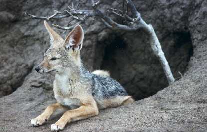 A jackal at the entrance of his burrow Nikon F3, 5,6/600 mm, Kodachrome 64, car-camera-mount.