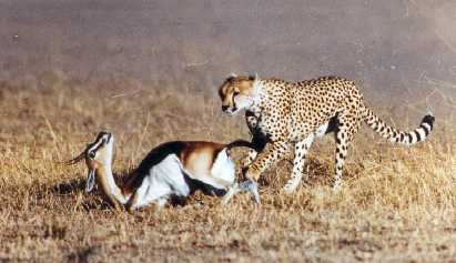 The female Cheetah has caught a Thomson Gazelle. Nikon F4, 4.0/600 mm, Ektachrome Panther 100, car-camera-mount. * * *