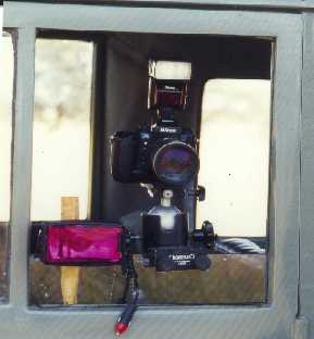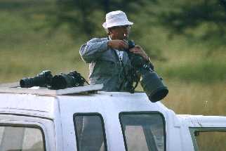 Das ist ein lustiges Bild und sieht mehr nach rasendem Fotoreporter aus als nach einem Naturfotografen. Tom Brakefield fotografierte mich hier vor meinem Start mit dem Ultraleicht. Der seriöse Hintergrund ist, daß man in der Luft besser keine Filme wechselt, weil direkt hinter dem Rücken sich der Propeller des Rasenmähermotors dreht, und wenn beim Filmwechsel durch die starke Luftströmung da oben einmal eine Filmdose davonfliegt in den Propeller hinein, dann ist das nicht unbedingt sehr komisch. Um also nicht alle zehn Minuten landen zu müssen ist es ratsam, sich einige Kameras umzuhängen. Diese hier sind mit den Brennweiten 2,8/24 mm, 2,8/55 mm und 2,8/70-210 mm bestückt. Mit dieser Kombination habe ich am Himmel über der Masai Mara die besten Erfahrungen gemacht: 24 mm für die weite Übersicht, 55 mm für die meisten und besten Landschaftsfotos aus der Luft, und 70 -210 rnm für Tieraufnahmen. Dazu offene Blende und Zeitautomatik, damit die Kamera immer die kürzest mögliche Verschlußzeit nimmt. Für Luftaufnahmen ist das Ultraleicht fantastisch geeignet, weil es recht langsam fliegt, und man keine Glasscheibe zwischen Kamera und Motiv hat. 90 % meiner Aufnahmen hier in der Masai Mara mache ich durch die Öffnung in der Wagentür, weil die Perspektive von unten fast immer wesentlich besser ist. Aber manchmal muß man eben doch aus der Wagendachöffnung heraus fotografieren, sei es weil der Radius von unten nicht reicht, um der jagenden Gepardin durch den Kameraschwenk zu folgen, sei es weil das Gras zu hoch ist; oder auch immer, wenn der Leopard im Baum oder auf einem Felsen liegt, und man dann eine zu steile Bildperspektive hierdurch vermeiden kann. Weil der Sandsack in der gestaltenden Naturfotografie nur ein Notbehelf sein kann, wenn es einmal ganz schnell gehen muß, habe ich mir für alle Situationen, wo man etwas mehr Zeit hat, ein Brett mitgebracht, das ich vor mir über der Dachluke befestige, und wo ich zwei Kugelköpfe unterbringen kann. Dadurch kann man immer gleichzeitig zwei Brennweiten auf einen Punkt fixieren und gewinnt so oft kostbare Sekunden, da man ja zwei Objektive, die auf Sandsäcken liegen, immer erst neu einrichten muß. Viele Spiegelreflex-Kameras haben heute Autofokus und/oder eine elektronische Einstellhilfe. Diese arbeitet so, daß bei hundertprozentig korrekter Scharfeinstellung im Suchereinblick ein grüner oder schwarzer Punkt erscheint und signalisiert, daß jetzt die Schärfe absolut richtig eingestellt ist. Diese beiden technischen Hilfsmittel sind für mich unbezahlbar wichtig bei Nachtaufnahmen; denn ich kann zwar im Scheinwerfer oder Taschenlampenlicht das Motiv erkennen, aber es ist mir völlig unmöglich, manuell bei diesem 'Restlicht' korrekt zu fokussieren. Erschwerend kommt noch hinzu, daß man kein weißes Einstellicht nehmen sollte, weil dies die Tiere oft irritiert, sondern besser Rotlicht, weil sie darauf meistens nicht reagieren. Aber auf Rotlicht einzustellen, ist noch schwieriger. Weil ich mit dem Lichtstrahl von Taschenlampen als Einstellhilfe nicht sonderlich zufrieden war - auch nicht mit den starken Stablampen, die angeblich bis 1.000 rn reichen - kaufte ich bei Kettner für DM 39,50 eine Lampe für Jäger, die man am Zigarettenanzünder des Autos anschließen kann, und beklebte sie mit einer roten Folie. Das Ergebnis war großartig: auf 20 -30 rn Entfernung kann man damit draußen bei Dunkelheit sogar noch mit Autofokus arbeiten, und die Fotografie von Afrikas Tierwelt in der Dunkelheit wurde zu einem reinen Vergnügen. Hier auf dem Bild sieht man meine Ausrüstung für die Arbeit in der Dunkelheit: Auf der Kamera ein SB-24 Blitz, der bei Reflektorstellung auf 85 mm und einem 200 ISO-Film bis etwa 15-20 m reicht, je nach Objekthelligkeit und Blende (bei Blende 5,6 10 rn, bei B. 4.0 15 rn und bei 2,8 bis etwa 20 rn). Diesen relativ schwachen Blitz nehme ich, weil er die Ausrüstung nicht sonderlich belastet, und auch keine besonderen Umbauten im Fahrzeug erforderlich macht. Wenn man gezielt sich auf Nachtfotos spezialisiert, ist sicher ein stärkerer Metz Stabblitz zu empfehlen. Links neben der Kamera sieht man den mit roter Folie beklebten Scheinwerfer. Es ist für mich immer wieder faszinierend zu beobachten, wie schnell und exakt Autofokus in der Dunkelheit bei einem kleinen bißchen rotem Licht noch scharfstellt, wo ich schon faßt Mühe habe, daß Objekt der Begierde überhaupt im dunklen Sucher noch zu finden. Die Leopardin Paradies liegt hier vor meinem Auto und döst so vor sich hin. Das ist eine zweischneidige, seltsame, merkwürdige, faszinierende und etwas unbehaglIche Situation: Auf der einen Seite bin ich natürlich hingerissen, daß eine ausgewachsene, freilebende Leopardin von ihrem Rastbaum herunterkommt, und sich neben mein Auto legt. Es ist schon faszinierend, eine große Katze so aus der Nähe zu beobachten. Fotografisch ist es allerding witzlos, weil der Winkel zu steil ist und der Hintergrund zu unruhig wird. . . Etwas problematisch ist es, weil es hier eine Regel gibt die besagt, daß man sIch einer der großen Katzen nicht weiter als 20 rn nähern soll. Nun habe ich mich der Katze ja nicht genähert, sondern sie ist zu mir gekommen, und wollte wohl das Auto als Tarnung benutzen, aber das können natürlich Ranger oder Touristen nicht wissen, wenn sie später dazu kommen. Für die würde es dann so aussehen, als wäre ein Naturfotograf so nahe wie möglich an Paradies herangefahren und würde sIe irgendwie in ihrer Behaglichkeitszone bedrängen. Daher bin ich in solchen Situationen immer fortgefahren und habe mehr Distanz zwischen dem Wagen und der Leopardin gebracht als dieser vielleicht angenehm war, wenn ich andere Fahrzeuge kommen hörte, um keinen falschen Eindruck zu erwecken. Dr. Horst Hagen, einer der besten Kenner der ostafrikanischen Tierwelt, der schon viele Bücher über diese faszinierende Welt schrieb, und den man oft in Afrika trifft. Hier fotografiert er im Augenblick 'meine' Leopard