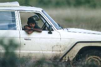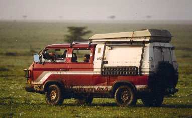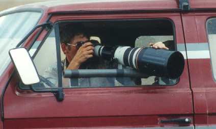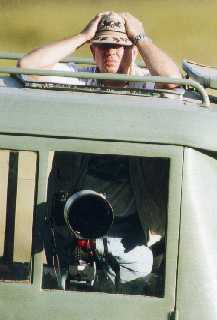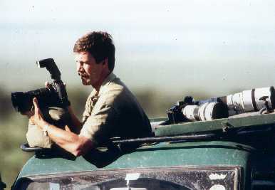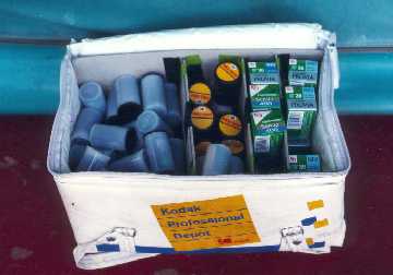 Der Naturfotograf Jean-Paul Ferrero aus Australien, der auch regelmäßig im Mara-River Camp anzutreffen ist. Weil er Moskitos haßt, benutzt er oft ein Schutznetz oder schlägt sie tot. Unsere Hinweise, daß man in einem Naturreservat keine Tiere töten darf, können ihn nicht beeindrucken. Eine unbekannte Filmcrew. Filme drehen ist etwas aufwendiger als Natur fotografieren. In diesen beiden Autos saßen sieben Mitglieder der Filmmannschaft. Der Kollege Anup Shaw, der in Nairobi lebt, und häufig mit seinem Bruder Manjoj zusammen in der Mara arbeitet. Der amerikanische Kollege Tom Brakefield schaut hier etwas skeptisch und scheint auf bessere Zeiten zu warten. Hier sieht man Jonathan Scott in voller Aktion. Er lebt mehr oder weniger die halbe Zeit in der Mara und die andere Zeit bei seiner Familie in Nairobi. Er hat etliche großartige Bücher über die Tiere in der Masai Mara und der Serengeti gemacht und ist eine der ganz seltenen Dreifachbegabungen: er kann fotografieren, schreiben und zeichnen. So eine Kodak Filmkühltasche steht bei mir im Wagen immer auf dem Boden neben meinem Sitz. Links die Fujichrome Sensia-100 Filme für - fast - alle Aufnahmen. In der Mitte die roten Kodachrome-200, für die 'blauen Stunden' ganz früh und ganz spät. Da der K-200 einen Braunstich hat, ist er sehr gut geeignet, eine zu blaue Farbbalance - etwa vor Sonnenaufgang oder bei Regenwetter - auszugleichen. Daneben ganz rechts die Fujichrome-4oo Diafilme, für lichtmäßig hoffnungslose Fälle. 400er Diafilme sind farblich katastrophal schlecht, und man sollte sie nur in alleräußersten Notfällen nehmen. * * *