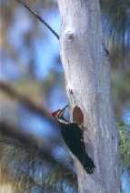 The Pileated woodpecker had his offspring toward the middle of April 2000 in a hollow about 8 meters off the ground in an Australian pine tree. This pine was located almost directly next to a road on the island of Sanibel in south western Florida. Therefore I was only able to take pictures from the other side of the road , where the telemeter of the lens indicated an exact 20 meter distance.