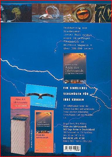 Das Problem war die Vermarktung, einen Verlag zu finden, der das Marktpotential dieses Konzeptes erkannte. Nachdem einige Naturbuchverlage abgelehnt hatten, fanden wir im Kreuz Verlag in Stuttgart einen kongenialen Partner für dieses Projekt, der erstens die Idee gut fand und mit trug, und durch Auflage und Preis dafür sorgte, daß es auch Marktchancen hat. Denn wenn man so einen Bildband bei 80.- bis 100.- DM ansiedelt, schränkt man natürlich von vorne herein seine Marktmöglichkeiten drastisch ein.