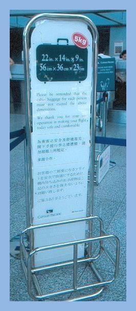 Allerdings nützt es Ihnen nichts, dass Sie diese Hürde des Frankfurter Flughafens (20x40x55) überwunden haben, wenn Sie anschließend mit einer Linie fliegen (Cathay Pacific) die nur 5 kg gestattet, oder eine mit den erlaubten Maßen 15x25x35 cm für Handgepäck (Buzz-Airline - kein Scherz, die gibt es wirklich).