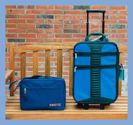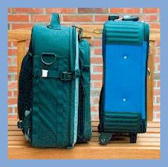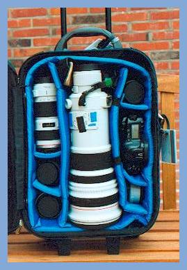 Zu diesem Zweck habe ich den inneren (blauen) Einsatz meines Lowepro Photo Trekkers in einen normalen Trolley (18x39x46 cm, mit Griff und Räder 54 cm) gepackt, und darin passt jetzt die (fast) komplette Ausrüstung.