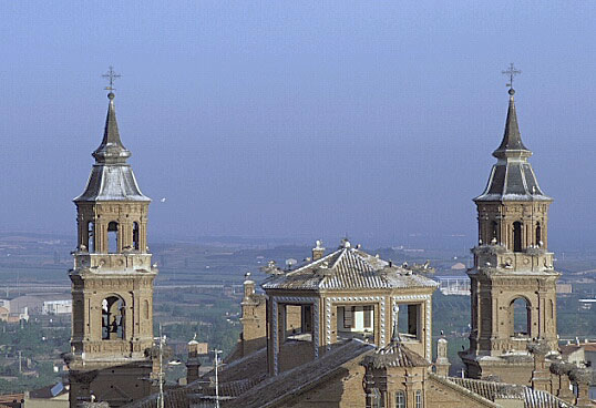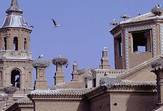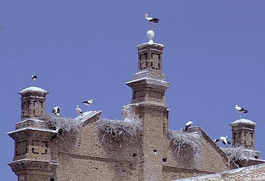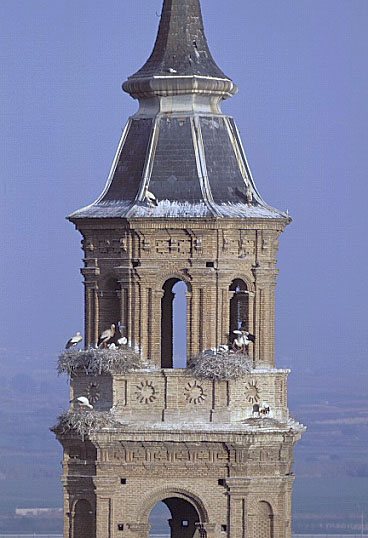 Fritz Pölking In the worlds capitol of storks with a camera White storks come back to their nests about every 1-3 hours to take their turns at sitting on the eggs – sometimes this takes a bit longer. When you are standing below the nest, on the street, it takes even longer or at least that is what it seems like. Then when a bird does approach the nest, he most certainly is flying from the wrong direction – from a cameras point of view – or he is approaching too low or you are just too surprised when he suddenly appears. Should any of that not happen at any given time, then the sun will more then likely not shine or there is a great big cloud right behind the nest. For pictures of storks in flight you have to have the sun behind your back and blue skies behind the stork. Before all of these conditions come to play in Germany you either have to have a whole lot of luck or you end up investing many weeks of time for maybe just one decent flight-picture. For that reason Uwe Walz and I decided to take these kind of pictures about 2 hours further south by plane, at the cathedral San Miguel in the small Spanish town of Alfaro in the Ebro valley and the capitol of the world for storks