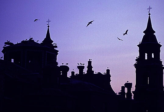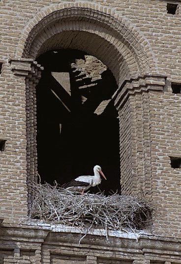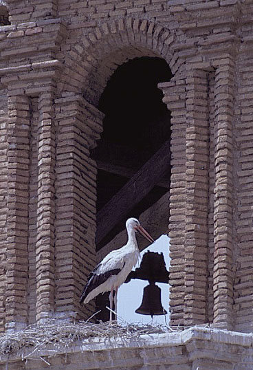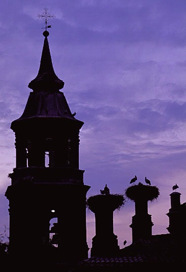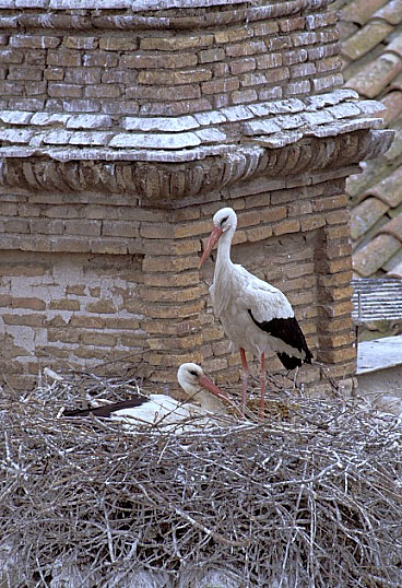 with the Nikon F5 on Sensia – 100 It is not to be disputed that we live in the best of all worlds – at least until a UFO lands. For nature photographers, Alfaro, with its colony of storks is a major part of it. The way to this paradise of and for storks is actually quite easy: direct flight with Aviaco to Zaragoza, then with a rental car to Zaragoza - Alfaro and the only hotel in place, the Palacio (0043-41-183944) and you are ready to take pictures to your heart’s content. I can recommend the book "storks – life on a cathedral (Störche-Leben auf einer Kathedrale) from the Tecklenborg Verlag (publisher) to those who are interested in wanting to know more about the "world’s capitol of storks". In this book we introduce the colony itself in detail and with many color pictures (In the German language). * * * * * |