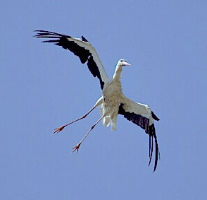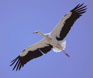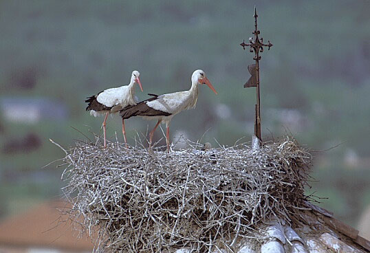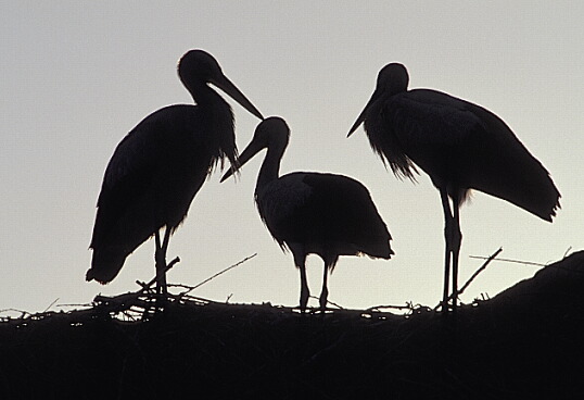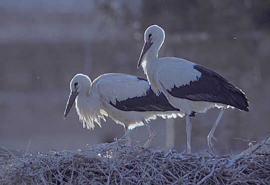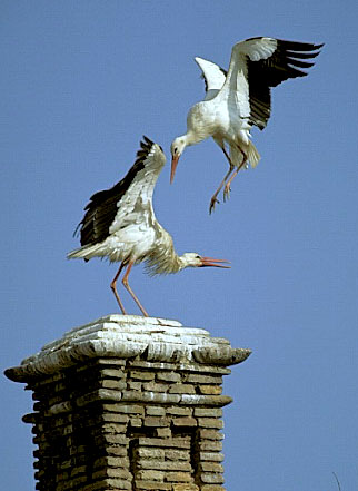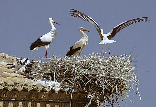 Something that would give any historical landmark preservationist in Germany a heart attack leaves Spaniards – much to the advantage of nature photographers – apparently completely unconcerned.: In Spain you can build an apartment building about 6 to 8 meters next to the cathedral in San Miguel, which is a National Spanish monument. The apartment building being so high, that you can look down into the nests of storks from the highest apartment. It is unbelievable: ten meters in front and two to four meters below you – at an optimal angle – you can find the active undisturbed family life of the white storks and with all your lenses at hand, no matter if it is 80-200 mm, 300 mm, 5 mm or 600 mm, you can work and create in a photographical paradise. Of course you can find other exquisite view points from other places around the cathedral that would make the heart of every wildlife photographer beat faster. You can practically find motifs from dawn to dusk. You can take wonderful pictures from the great square in front of the cathedral and the street called "Calle de Hospital" (Hospital Street). This offers a grand view of the colony during late afternoons and sunset - especially at that time, as that is when the birds return from their search for food. Then just a bit behind the cathedral there is a hill with a platform that is situated in such a way that you have a great view of the colony and can take interesting pictures of it and of the city itself. For all those reasons nature photographers will find Alfaro is certainly worth a short vacation or at least an extended weekend. Those who fly there sometime between March and July, let’s say on a Friday and return on Monday or Tuesday will have two or three photographic working days during which you will have the opportunity of taking more and much better pictures of storks then you would in Germany in a whole year. The things you need are an AF-camera and lenses starting at 24 mm up to 500 mm or 600 mm and good tripod. You have to count on a minimum of 10 rolls of film a day. A tremendous amount of film material will be shot through your camera alone for the flight pictures. Not because it is absolutely necessary, but because it is so much fun. We did not just want great results, we wanted to just shoot photos in general and that’s what is so great here, you have such wonderful possibilities to just let the camera run really hot. When you spend so many days and so much time taking pictures of storks you observe and discover many interesting things about the behavior of these birds: How the parent birds bring back water and offer it to their offspring in their goiter or that the Alfaro-storks feed a lot of fish. On many an occasion we observed the storks standing in the Ebro River to catch fish and during the transfer of their catch to the youngsters we saw that there were some sizeable specimen amongst them. We also discovered that there was a chance here to take pictures of storks with back light during sunset. For that a dark background is very helpful in order to heighten the effect, something that is not a given in Germany while taking pictures of storks in their nest or at least not normally. Here in Alfaro, on the southern side of the church there are aviaries where you have this situation in the evening with back light and that is an opportunity we certainly did not want to miss. But it wasn’t really that easy: the better the light was – meaning the lower the sun was on the horizon – the more direct the light hit the lens and then just before the sun set, when the light was absolutely at an optimum, not even the double sunscreens with the 600 lenses were of any use. So one of us always had to give up taking pictures, in order to take a piece of cardboard and shield the other’s lens so that no sunlight would shine directly into the front of it. It was astonishing and unbelievable to see and find the difference between absolute brilliance and a complete over-exposure depending on if you only worked with the two sunshades or on the other hand, the additional shielding of the lens with a piece of cardboard which hindered the sun from shining directly into the lens. All pictures