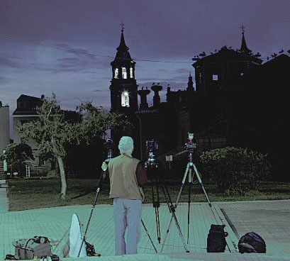 There a nature photographer is presented with an overwhelming picture: you will see over a hundred nests on the rooftop, battlements and towers of this church. In addition to that the photographic possibilities are terrific: as is expected in Spain, you almost always have sunshine and blue skies as well as storks, storks and more storks. You don’t have to wait until one of them comes sailing in every 2-4 hours for a change of shift. With more then two hundred parent birds – not counting the ones who are not breeding – you hardly have one moment during the day where there is not one or more of the storks ready to land at the same time and from all different directions. Add to that the luck you need: the cathedral is built on a hill and there is an apartment building directly next to it with a gigantic set of open air stairs which – due to the hill – are not at the foot of the cathedral, but up about halfway. This takes away the sharp upward camera angle and you are almost on the same height as the roof of the church when shooting the pictures of flying storks which is an absolute positive asset as far as the size and perspective of the subject at hand is concerned. Then you have these great possibilities on top of that, for instance this technology of the auto focus with pictures where you move the camera along with the flight of the bird, which is actually a "tracking auto focus". With this technology which is in principle the same with all different types of camera systems but has a different name with each, the path of movement that will be taken from the object until the actual picture is taken is pre-determined and thus guarantees an unbelievable accuracy in respect of clear and sharp pictures of moving animals in a totally unexpected way. I am not sure just how well this AF works while taking pictures of a rabbit’s choppy path, but I know it works with approaching storks in flight just great. Simply said it is unbelievable and works like a charm: No matter if you use a Canon, Nikon, Minolta or Pentax SLR, you just adjust your camera to the tracking auto-focus setting and when you see a tiny speck far away and up high in the sky you take it into the AF-field – when the speck gets a bit bigger, and watch in awe when it stays in focus and completely clear. The stork gets closer and closer, gets bigger and bigger in the view finder – but the razor-blade sharpness is constant. What a fantastic possibility for taking really clear pictures has been presented to us by modern camera technology. The both of us stood there, at times for hours, on that great big open staircase and just took pictures of flying storks – hundreds. Sometimes many storks came at the same time and we didn’t know which we should point the lens at. A small problem with these flight pictures was the right exposure: A white stork with the blue sky in the background is sure to be lighter then the middle measurement on the grey scale and would need a slight correction in the exposure time. After several trials I ended up with an optimal setting through the automatic timer and an overexposure by 0.3 to 0.7 on the grade, meaning 1/3 to 2/3 apertures. With this small correction of the exposure time, it turned out flight pictures with an optimal exposure. We used the automatic timer because it is the only automatic measuring method with an open aperture and guarantees the absolute shortest possible exposure time. So if for instance we use a focal length of about 500 and 600 mm with an open aperture of 4.0 to work with, then the cameras are able to obtain the shortest exposure time from the automatic timer on their own. It is not as easy as that if you use an automatic program or aperture. The manual setting of time and exposure was also difficult – even though we prefer that method – because the exposure had to be adjusted depending on the angle of the approaching bird, which again was not really acceptable because of the time involved and of course we would much rather concentrate on the subject itself and not on the working of the equipment.