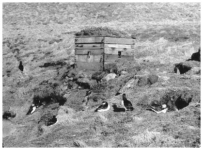 Fester Ansitz in einer Papageitaucherkolonie auf Skomer Island * 1957, Fair Isle,