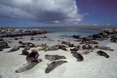 felsigen Strand der Insel lagen etwa 200-300 Seelöwen. 30 Meter