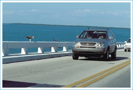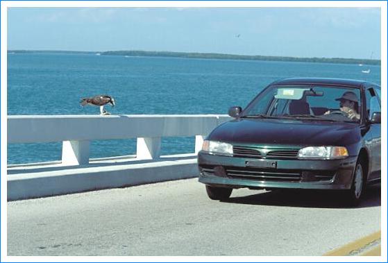 Das wollte ich natürlich fotografieren. Dazu mußte ich aber erst diese Brücke zuende fahren, dann auf dem Strandstreifen wenden, die Brücke wieder zurückfahren - am Adler vorbei - um dann auf der Insel wieder zu wenden und - jetzt mit schußbereiter Kamera - zum dritten Mal über die Brücke zu fahren, um den Adler mit den ganz nahe an ihm vorbeifahrenden Autos zu fotografieren.