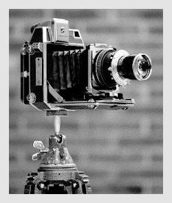 Zuerst einmal muß man den Zentralverschluß am Objektiv spannen und ihn öffnen. Dann unter einem Tuch verschwinden, um auf der Mattscheibe mit einem seitenverkehrt und kopfstehenden Motiv zu komponieren und scharf einzustellen.