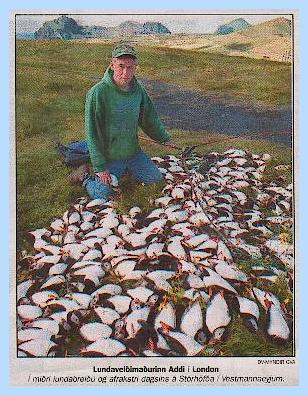 Die Papageitaucher haben hier auf Island natürlich auch Feinde: Ratten, Eisfüchse, Mantelmöwen, Isländer und Skuas. Die Isländer fangen sie mit Schmetterlingsnetzen in der Luft über den Brutkolonien. Ein Fänger kann pro Tag bis zu 900 Lunde fangen - jede Minute einen. Für die Beute bekommt er bis zu $ 2000.- pro Tag. Pro Saison kann er mit toten Papageitauchern bis zu 70.000,- US-Dollar verdienen. Sie werden als Vorspeise in den Restaurants in Reykjavik serviert.