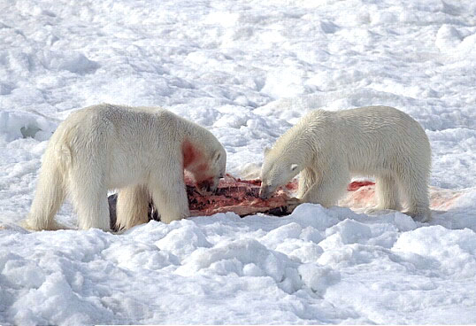 6. Tag Der Vormittag brachte eine spiegelglatte See mit wundervollen Reflektionen der treibenden Eisfelder, die sehr schön aussahen im Weitwinkelzoom mit einem Polfilter davor. Viermal ließen sich Bartrobben auf Eisfeldern fotografieren, manche sogar mit einem Spiegelbild in der glatten See. Der Nachmittag brachte das Aktion-Wildlife-Highlight der Reise: Ein Eisbär zog eine soeben erbeutete Bartrobbe aus dem Wasser und zog sie mit einer blutigen Spur etwa zwanzig Meter über das Eis. Dann fing er an zu fressen und bald war der Schnee blutgetränkt und auch der Kopf und Hals des Eisbären waren rot vom Blut der Robbe. Das gab echte Bilder aus dem wirklichen Leben, die aber sicher nicht sehr erfolgreich sein werden, denn so viel echtes Leben wollen die wenigsten Zeitschriften-Redaktionen veröffentlichen. Als Höhepunkt kam dann eine Stunde später noch ein zweiter Eisbär dazu, und der erste gestattete ihm etwa 15 Minuten lang mit von der Robbe zu fressen, um ihn dann zu verjagen. Der erste Eisbär fraß dann sage und schreibe über 6 Stunden an der Robbe in formatfüllender Entfernung für ein 500 mm Objektiv ohne Konverter. Also reichlich Zeit für jeden, nach Herzenslust blutige Bilder aus dem wirklichen Leben zu machen. Dies ist auch der große Spaßfaktor der digitalen Fotografie: Man fotografiert sensationelle Bilder von Eisbären die eine erbeutete Robbe verzehren, und kann sich eine Stunde später in der Bar des Schiffes die Bilder auf dem Labtop ansehen, sie ausdrucken und die Ergebnisse mit allen an Bord teilen. Auf Film fotografiert dauert es Wochen bis man weiß, was man fotografiert hat, wie man es fotografiert hat, und ob alles technisch und gestalterisch in Ordnung ist.