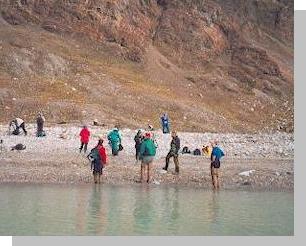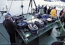 Sensia -100 Velvia -100 13. Tag Nach dem Frühstück sollte es mit den Zodiak-Schlauchbooten an Land gehen, um Rentiere, Füchse, Raubmöwen, Seeschwalben, Blumen und Flechten zu fotografieren. Nicht zu vergessen die tolle Landschaft. Durch einen Wettereinbruch war leider plötzlich die See so rauh, der Wind so streng, die Temperatur so niedrig und die Sicht so schlecht, daß dieser Trip verschoben wurde, und wir vor Anker warteten, daß am Nachmittag vielleicht die Bedingungen besser würden. In der Zwischenzeit sprach Dr. Wayne Lynch über Nahfotografie. Das Wetter besserte sich aber nicht, und so fiel unser letzter Fototag leider ins Wasser. Kismet.. 34 Naturfotografen an Bord arbeiteten mit analogen Kameras (22 mit Nikon und 12 mit Canon), 8 arbeiteten mit digitalen Kameras von Nikon oder Canon. Fünf davon hatten einen Labtop an Bord (einer auch einen Drucker). 3 Teilnehmerinnen hatten kleine, digitale Filmkameras. An Objektiven gab es ein 4.0/600 mm, etwa zwanzig 4.0/500 mm und ebenfalls etwa zwanzig hatten eines der relativ neuen 80/100 – 400 mm Zoomobjektive.
