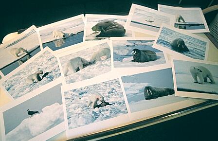 5. Tag Die See meinte es gut mit uns, und wir hatten das, was man gemeinhin ‚Ententeich‘ nennt. Gegen 9.30 Uhr erreichten wir ‚Bärenland‘, eine Gegend auf Spitzbergen, wo sich zwischen Eisschollen und Schnee besonders gerne etliche der 2.000 Eisbären von Spitzbergen aufhalten, und das nicht allzu weit entfernt ist von den Gebieten, wo die Bärinnen in Schneehöhlen ihre Jungen zur Welt bringen. Der Vormittag brachte schöne Eisfelder und 3 einzelne Walrosse auf Eisschollen. Der Nachmittag brachte noch ein Walross auf der Eisscholle, einen im Meer schwimmenden Eisbären und Regen.. Der späte Regen wurde von Joe Van Os für einen Diavortrag über die richtige Belichtung von Motiven genutzt, die heller sind als der mittlere Grauwert. Nach dem Abendessen tauchte dann auf den Eisschollen noch ein freundlicher Eisbär auf, der sich tatsächlich 1 ½ Stunden lang vom Schiff aus fotografieren ließ und bei dem um 22.10 Uhr der Belichtungsmesser bei Blende 4.0 noch 1/320 sek. anzeigte beim 100 ISO-Film. Das ist der Vorteil, wenn es so nahe am Nordpol (nur 600 Meilen entfernt) im Sommer 24 Stunden am Tag nicht dunkel wird.