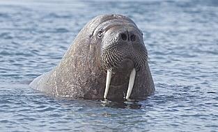 9. Tag Heute Vormittag war Walrosszeit. Etwa 40 Walrosse dösten am Strand, als wir mit den Zodiaks dort hin fuhren und an Land gingen. Wir machten es uns am Strand in etwa 100 Meter Entfernung in Wassernähe bequem, und einige Zeit später gingen 5-10 Walrosse ins Wasser und kamen zu uns geschwommen bis auf wenige Meter Entfernung. Anscheinend hatten sie noch nie oder kaum Menschen gesehen und wollten sich die mal anschauen. Etwa zwei Stunden lang fotografierten wir sie mit ihren beachtlich Stoßzähnen, wenn sie vor uns auftauchten. Auf dem Weg zu den nachmittäglichen Eisbären im Packeis hielt Rinie Van Meurs einen Diavortrag über Grönland.